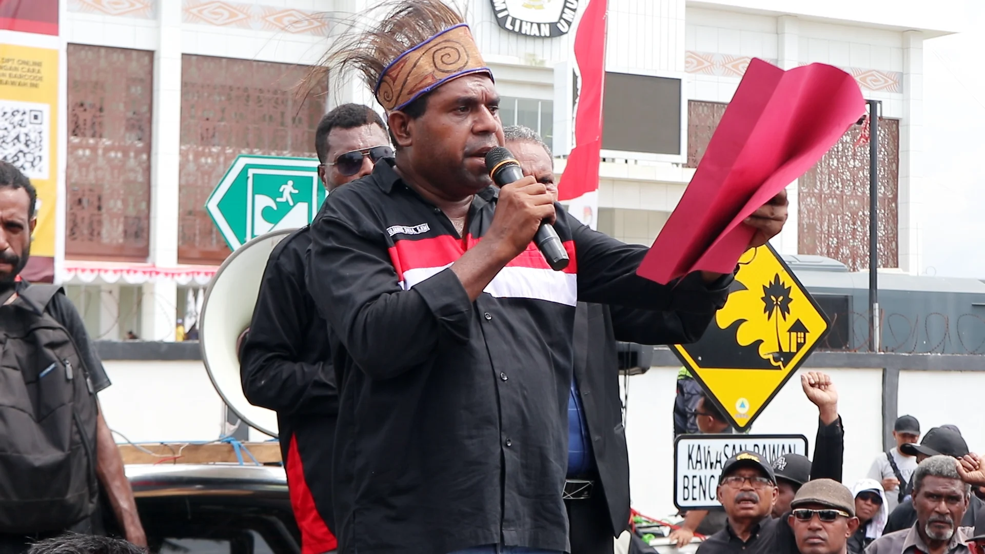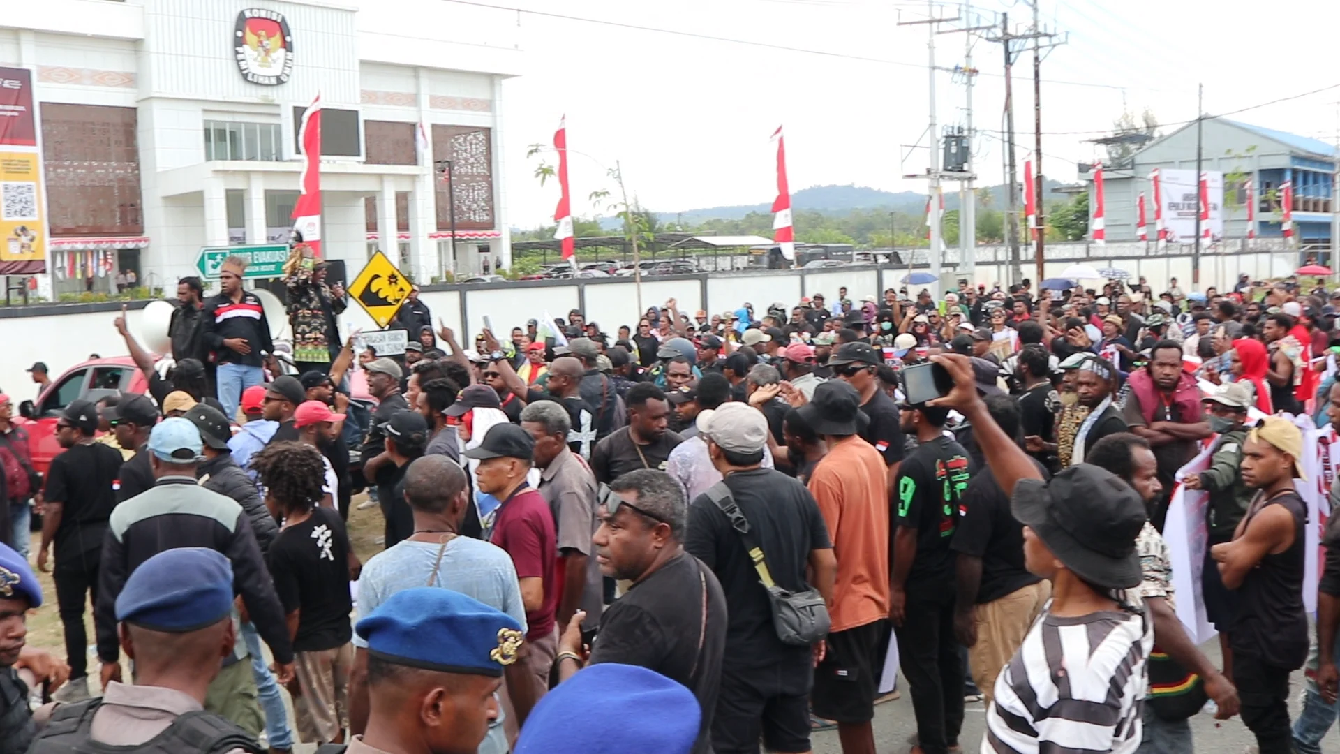 Terlihat tokoh masyarakat, tokoh agama, tokoh pemuda serta ketua-ketua paguyuban turut berorasi, menyampaikan kekecewaan mereka terhadap berbagai dugaan kecurangan yang dilakukan penyelenggara PSU Pilkada Papua.