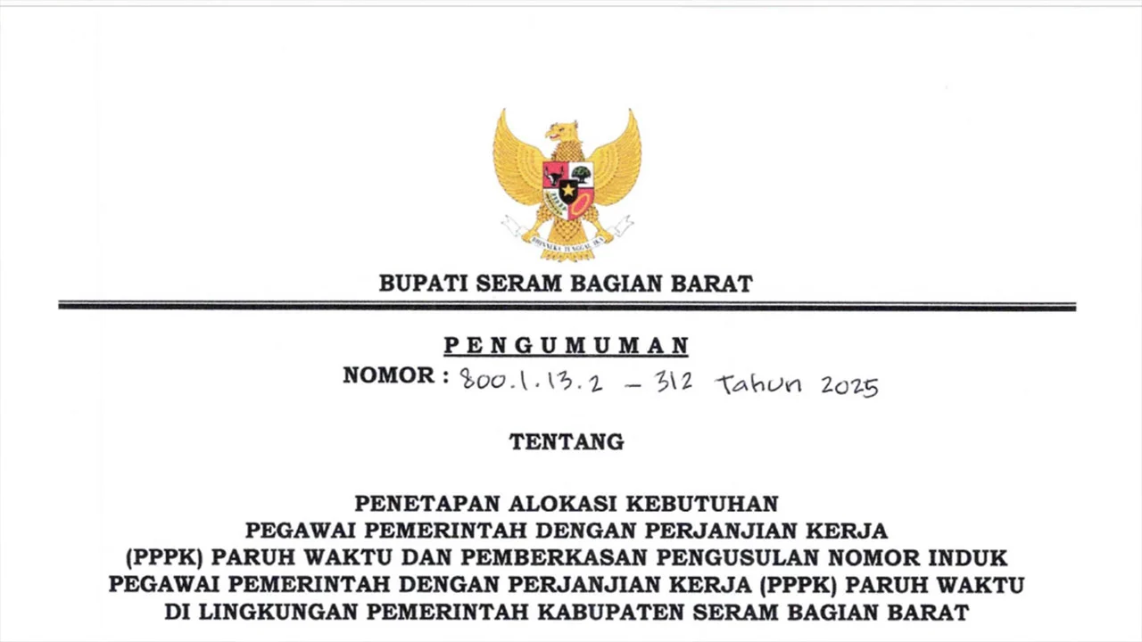 Nusaelaknews.com | Piru, Maluku – Pemerintah Kabupaten (Pemkab) Seram Bagian Barat (SBB) resmi mengumumkan alokasi kebutuhan Pegawai Pemerintah dengan Perjanjian Kerja (PPPK) Paruh Waktu Tahun 2025. Pengumuman ini tertuang dalam Surat Nomor: 800.1.13.2/312 Tahun 2025 yang ditandatangani Bupati SBB, Ir. Asri Arman, MT.