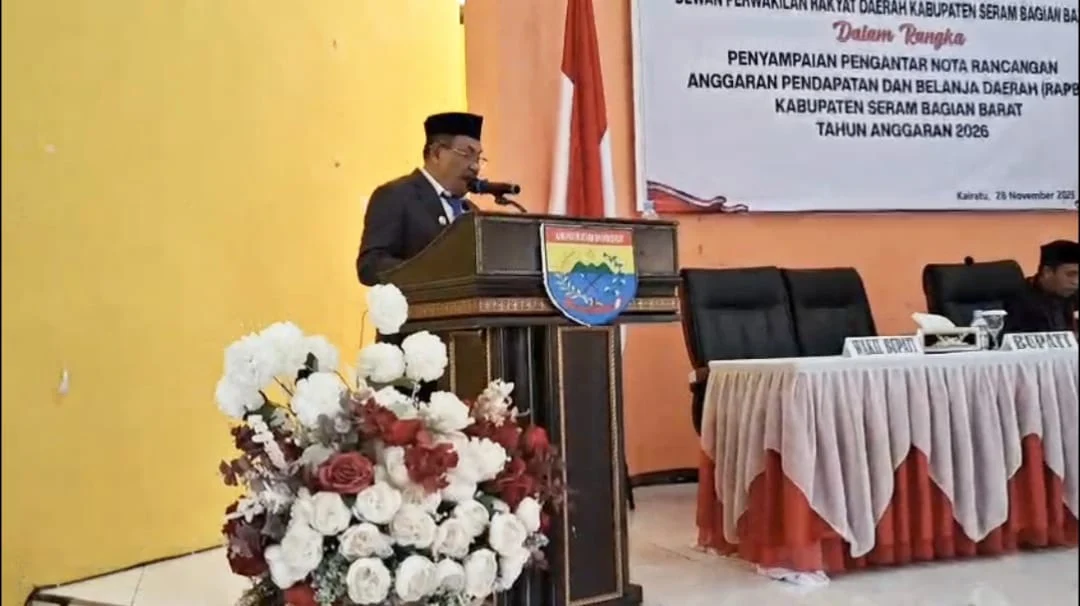 Nusaelaknews.com | Kairatu, Maluku – Wakil Bupati Seram Bagian Barat (SBB), Selfinus Kainama, menyampaikan pidato pengantar Nota Keuangan Rancangan Anggaran Pendapatan dan Belanja Daerah (APBD) Kabupaten SBB Tahun Anggaran 2026 dalam rapat paripurna DPRD SBB, Jumat, 28 November 2025.